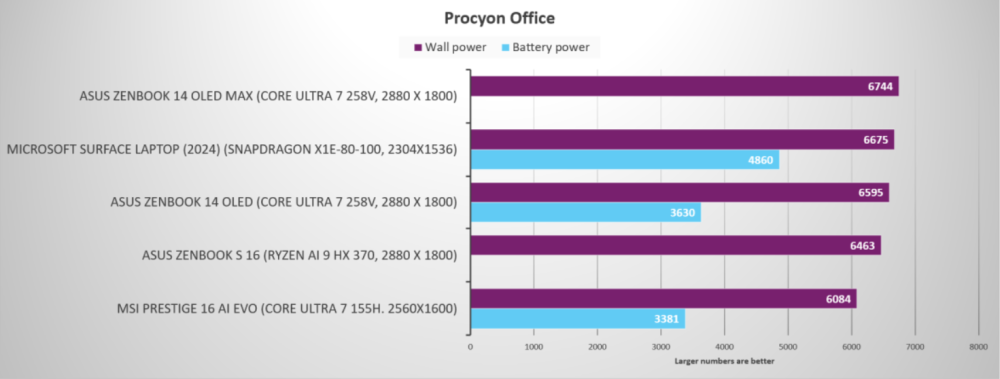 Det er seks en halv time mere end de øvrige platforme fra Intel og AMD. En Ryzen 9 AI HX 370 maskine med 78 Wh batteri og 16 tommer skærm klarer alene 10 timer og 42 minutter væk fra stikkontakten, mens en Asus Zenbook 14 med sidste års Core Ultra 155H og 75 Wh klarer sig dårligst med 10 timer og 35 minutter.