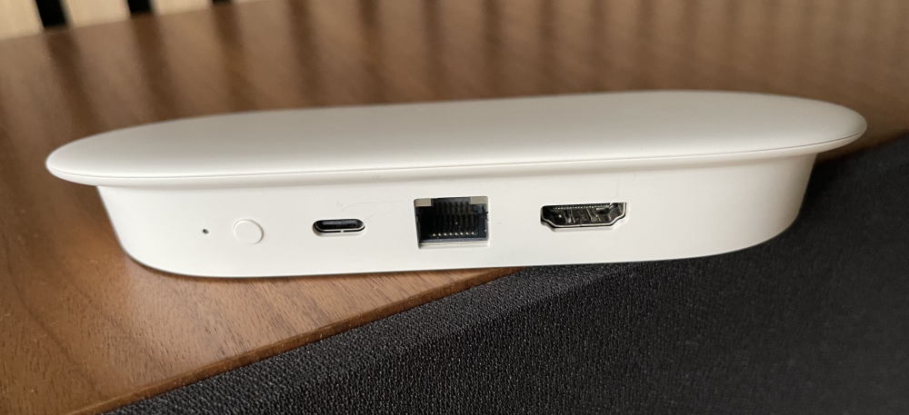 Bagpå finder du en Ethernet-tilslutning, HDMI og USB-C-stik. Der medfølger en ekstern strømforsyning til USB, men andre kan naturligvis benyttes.