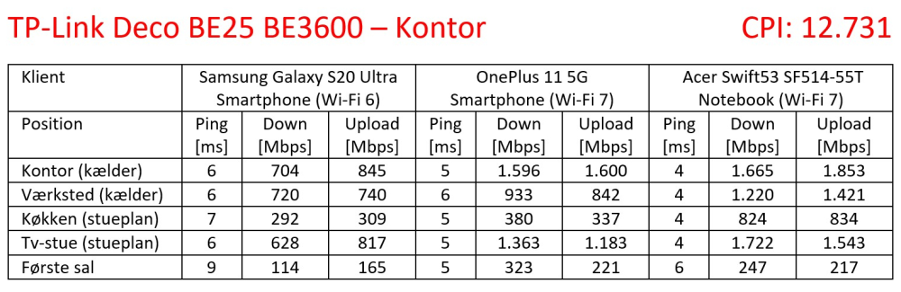 Det er bemærkelsesværdigt, at Deco BE25-sættet ikke blot ligger i samme prisklasse som Archer BE550-routeren. De to wi-fi-løsninger kommer også ud med praktisk talt identiske CPI-scoringer – 12.731 og 12.873, henholdsvis. Alligevel performer de meget forskelligt i mit testmiljø.