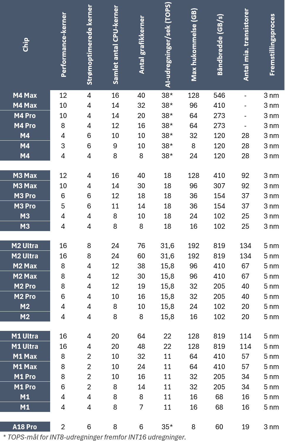 - M4: Apple iPad Pro, Mac mini, iMac og Macbook Pro 14 & 16