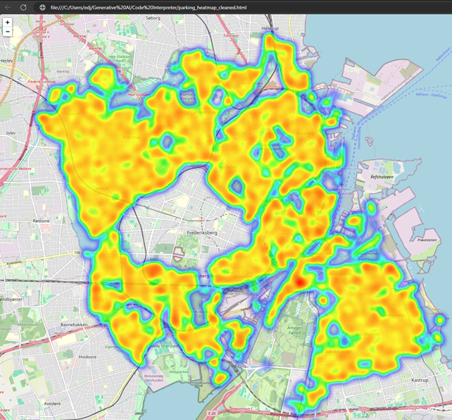 Den kunne endda generere en dynamisk hjemmeside-fil i html med et heatmap over parkeringsområder på et geografisk kort, som jeg kunne zoome ind og ud af – klar direkte til download og brug: