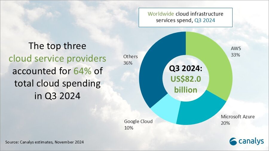 Tre virksomheder står alene for næsten to tredjedel af investeringerne i cloud: AWS, Microsoft Azure og Google Cloud.