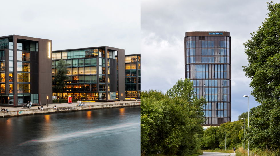 Systematics 58 meter høje hovedkontor på Søren Frichs Vej i Aarhus og Netcompanys, nyrenoverede hovedkontor, der næsten hænger ud over de vandfyldte kanaler på Strandgade i det centrale København.