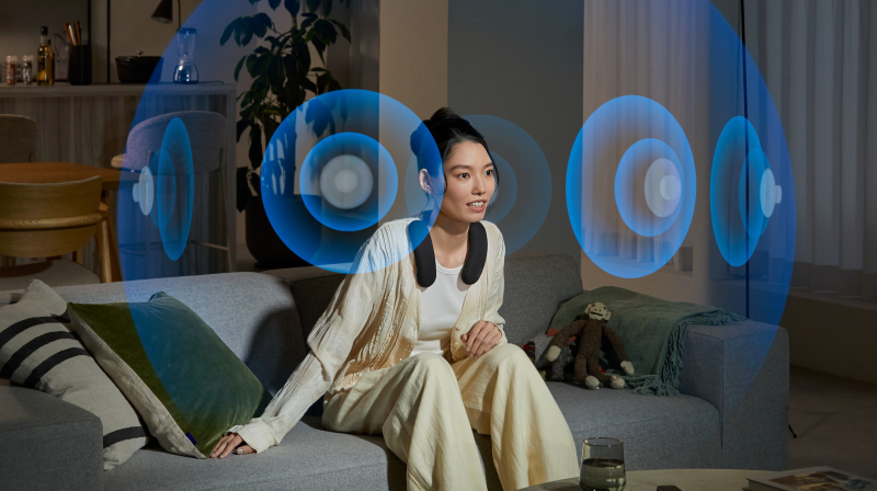 Bravia Theatre U er ret beset en lille enhed med indbyggede højttalere, som du kan smække på skuldrene, så højttalerne der spiller op mod dine ører.