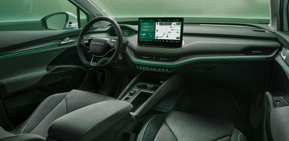Selve fronten låner det skarpe ’Tech Deck’ udtryk fra den spritnye Elroq, mens aerodynamikken generelt er bearbjedet yderligere, så den mest strømlinede ’Coupé’ variant kan tilbagelægge 596 kilometer efter WLTP-normen.