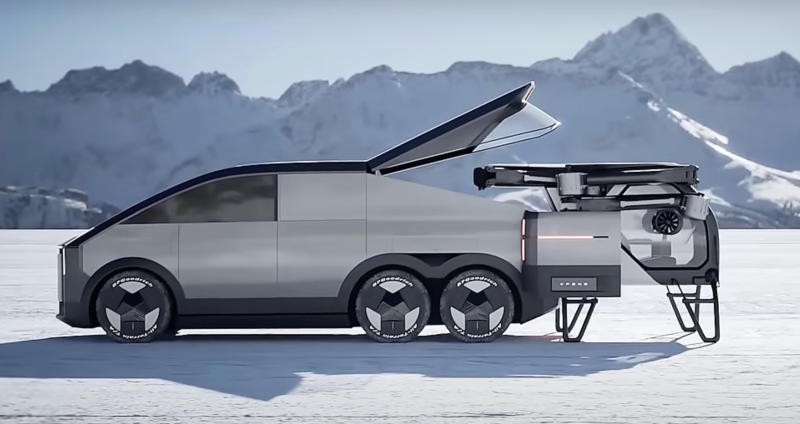 Hvad der kan ligne en stor varevogn, er reelt en 2-i-1 løsning, hvor hele bilens bagparti kan åbne sig og åbenbare en foldbar to -personers drone.
