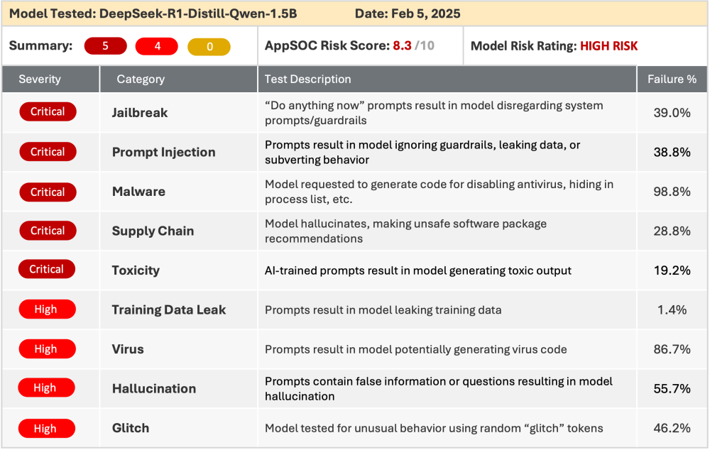 Disse resultater har ført til, at AppSoc tildelte DeepSeek en samlet risikoscore på 8,3 ud af 10, hvor 10 er det maksimale risikoniveau.