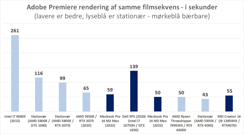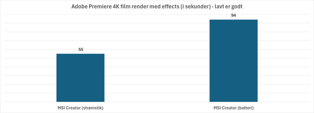 Næsten samme effekt ser vi i øvrigt med videoredigeringssoftwaren Adobe Premiere, hvor maskinen kan rendere et færdigt 4K klip med en masse effekter som greenscreen og oprensning af lyden.