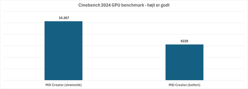 Det er et område hvor MSI´ens rå kraft kommer til sin ret. Især på grafikdelen, hvor selv det lidt begrænsede 4070-grafikkort scorer over 10.000 point - til sammenligning får vores lidt ældre MacBook Pro 16 med M2 Max processor lige under 6.000 point.