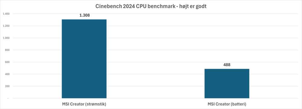 Så længe du altså har strømkablet sluttet til. For på batteri falder grafikydelsen til cirka 60 procent af "normalen" med strømstikket i. CPU-ydelsen er dog virker hvor "batterieffekten" slår igennem, for her reduceres CPU-kraften med næsten 2,5 gange.