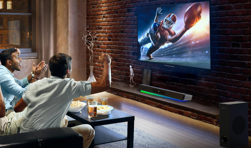 Den har endda en medfølgende fjernbetjening, så du kan skifte mellem film-mode og lyd, der er bedre til gaming.