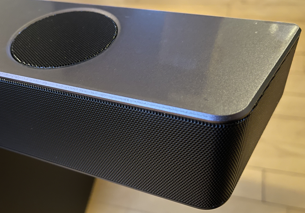 Den er beskedne 6,2 centimeter høj, 60 centimeter bred og har også opadvendte højttalerenheder. På toppen er der små knapper, så du let kan styre funktionerne, hvis du har forlagt fjernbetjeningen.