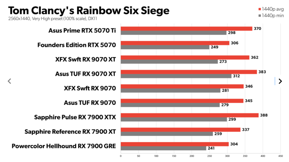 I F1 2024 og Tom Clancys Rainbow Six Siege trækker RX 9070 fra RTX 5070 mens XT-kortet løber fra Ti-kortet.