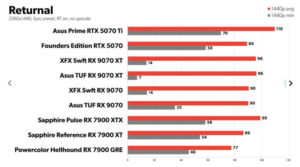 I spillet Returnal er 5070 og 5070 Ti hver især bedre end deres respektive udfordrere, særligt når det gælder fps-minima, hvor AMD-kortene synes at hakke af og til.