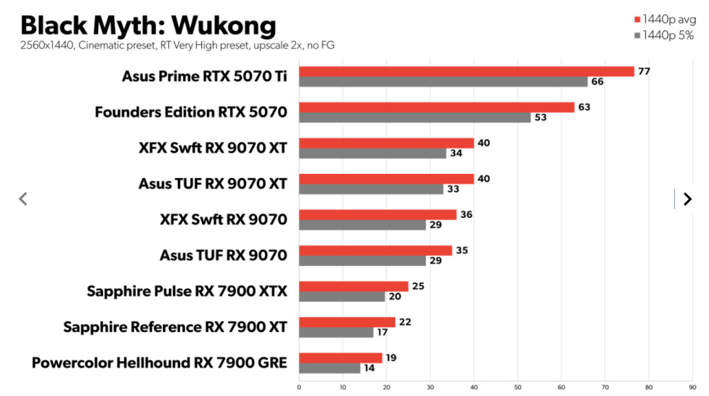 I test foretaget i otte forskellige spil-discipliner, (både med og uden ray-tracing AI-drevet opskalering) viser RX 9070 og RX 9070 XT at være oplagte konkurrenter til henholdsvis Nvidia RTX 5070 og Nvidia RTX 5070 Ti.