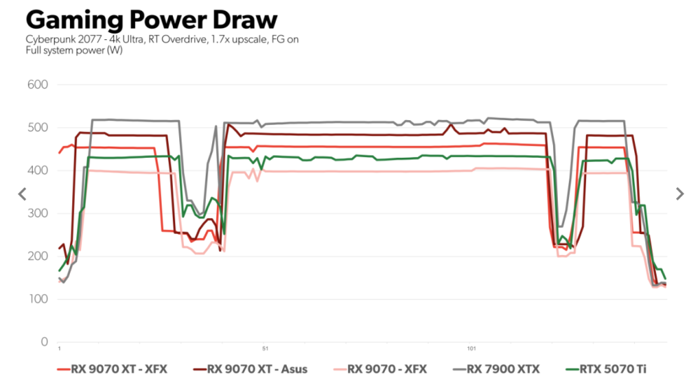 Mens RX-kortene altså generelt trækker det længste strå, er billedet noget mere meleret hvad angår strømforbruget, hvor RX 9070 XT-systemer har det med at trække mellem 20 og 80 watt mere strøm end RTX 5070 Ti-kortet.