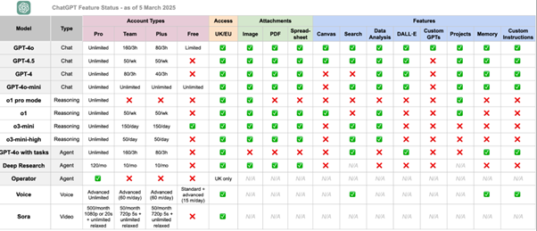 Hvis I er forvirrede over OpenAI’s mange modeller, og hvad de kan, så faldt jeg over dette skema, som jeg ihvertfald havde fornøjelse af.