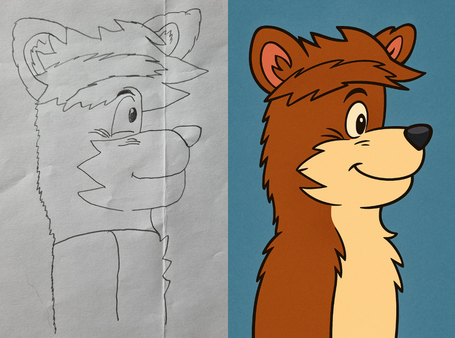 "Lav en vellignende tegneserie-version som billede af denne tegning med fint layout og farver."