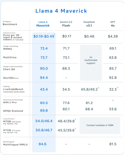 LLama 4 Maverick er ifølge Meta selv i stand til at matche og overgå modeller som Deepseek V3.1 og ChatGPT 4o, hvilket den vel at mærke gør til en samme eller lavere pris.