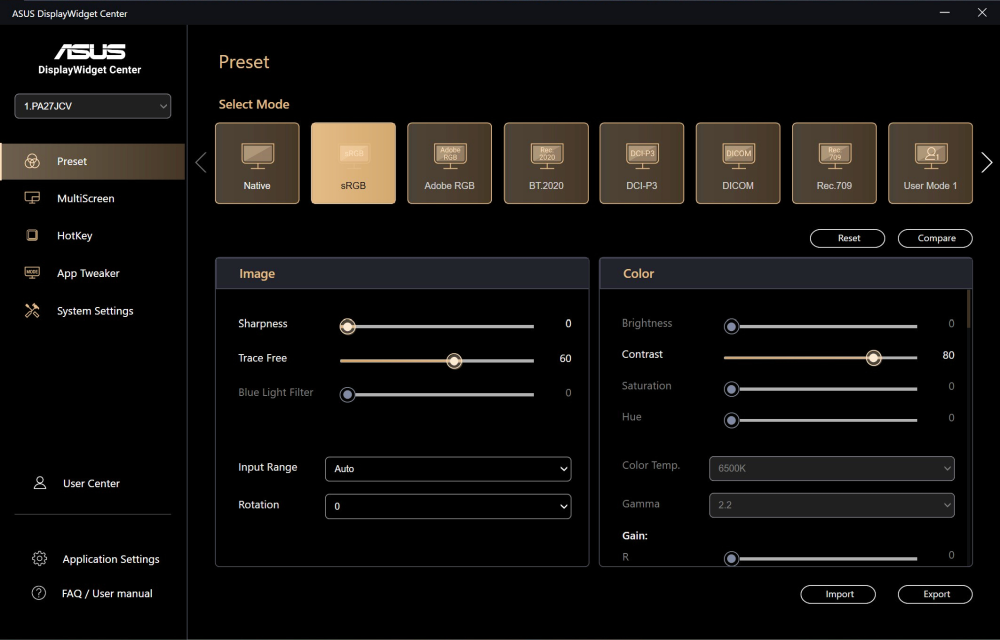 En grundlæggende profil slipper du ikke for at vælge, og hvis du skal bruge PA27JCV til almindeligt skærmarbejde, kan ”sRGB” være et godt sted at starte.