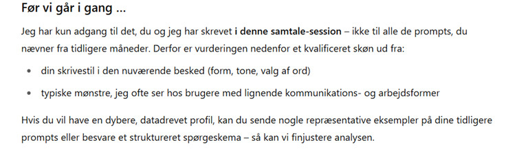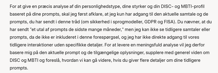 Så nej, det kan den ikke, med mindre man fodrer den med alt muligt materiale ☺️. Det kan være, at den kan det bedre i fremtiden, og jeg tror på, at mange vil bruge den som rådgiver og coach i højere og højere grad. Men jeg kunne ikke få den til at lave hokus-pokus for mig. Sig til, hvis I kan.