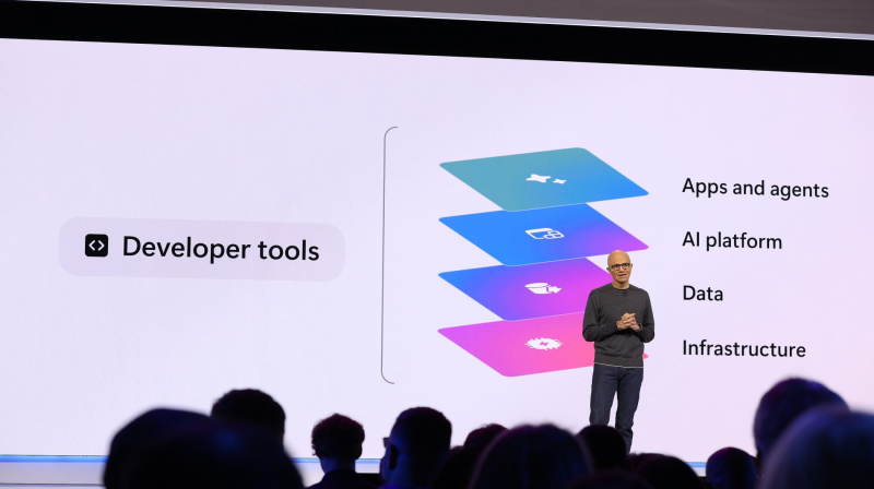 De lag topchefen nævner er de fire lag i Microsofts softwareudvikling. Der er tale om: Apps og agenter, AI platform, data samt infrastruktur.