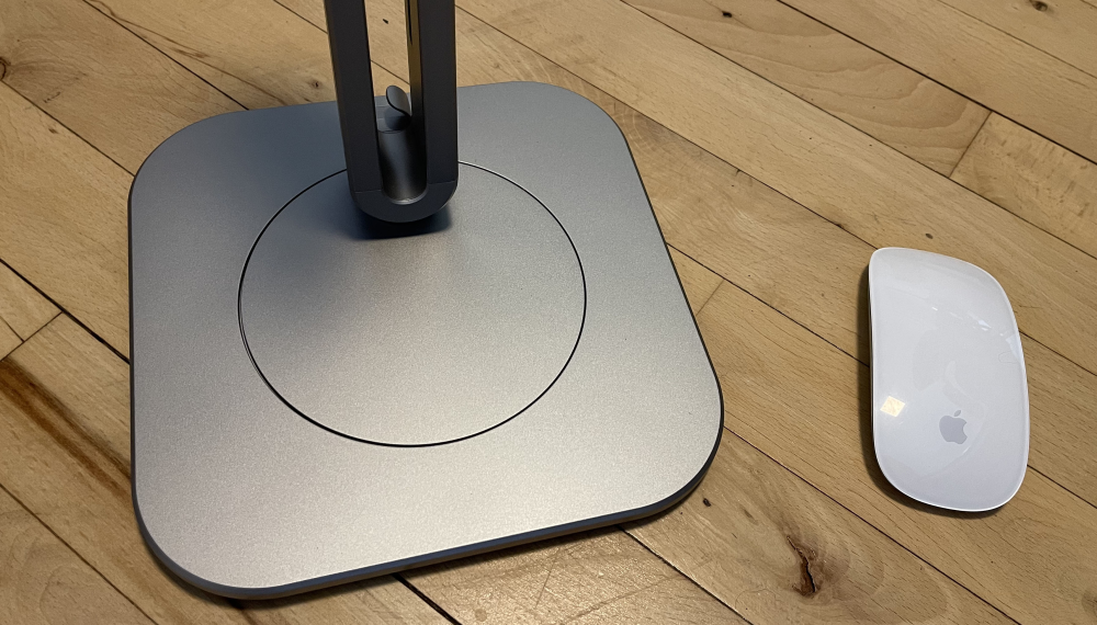 Skærmen står på en – for sin størrelse – forholdsvis lille fod. Men den er af metal, og skærmen opleves solid – også når du roterer den på højkant.