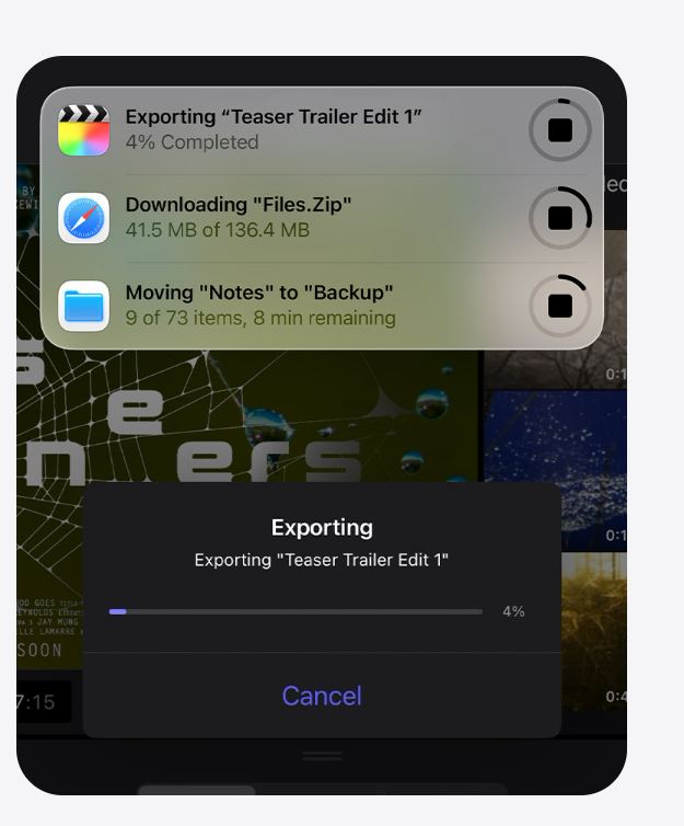 Store opgaver som eksport af video eller store downloads kan nu køre i baggrunden, altså den multitasking, som vi i mange år har taget for givet på andre maskiner - men som på mobile enheders ukomplicerede interface kan være svæ at få overblik over.