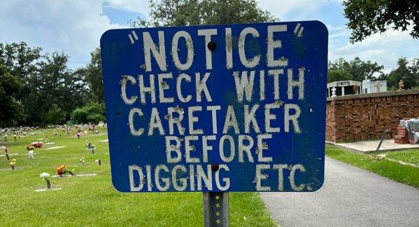 Min gamle ven Kim har været i mit elskede Louisiana på ferie og faldt over dette skilt på en kirkegård. Tak for dét.
