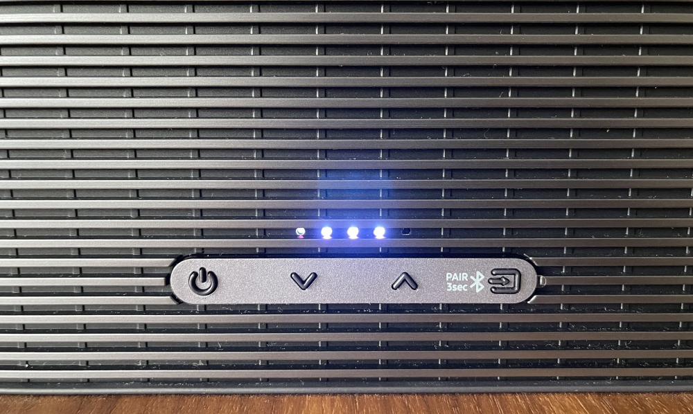 Volumen kører naturligvis via HDMI ARC, men en lille, fin fjernbetjening medfølger. Her kan du hurtigt justere basniveauet – en stor fordel de sene timer, hvor bassen hurtigt kan blive for voldsom.