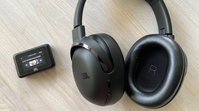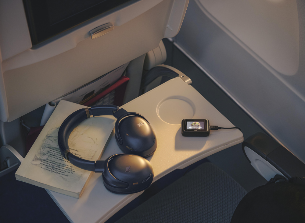 En lille sender med touchskærm kan styre JBL Tour One M3 over-ear-hovedtelefoner, så du kan få lyden sendt trådløst og samtidig se, hvad underholdningssystemet på flyet kan byde på. Det er da ret smart.