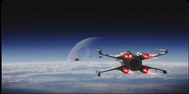 Her ses, hvad der ligner en rum-fighter fra ’Star Wars’, med kurs mod ’Dødsstjernen’ – et vink til enhver Star Wars kyndig om, at den skræmmende sci-fi stjerne står til at blive tilintetgjort.