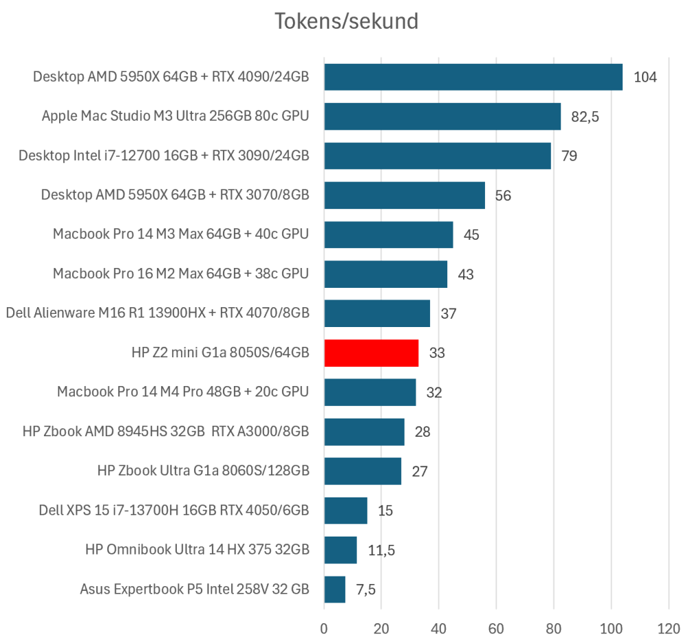 Ud fra de 50+ tokens/sekund der opnås med OSS 20B, vil jeg nu estimere at 30 tokens/sekund kan forventes med den dyrere 128 gigabyte topmodel. En anden sværvægter, GLM 4.5 Air (107B Q2), kunne jeg dog få til at levere knap 20 token/sekund.