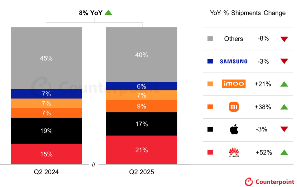 Her ses det, at den kinesiske tech-gigant stormer frem i andet kvartal 2025, ved at tilegne sig markedsandele på 21 procent, som effektivt puffer Apple ned på en global andenplads, med sin markedsandel på 19 procent.