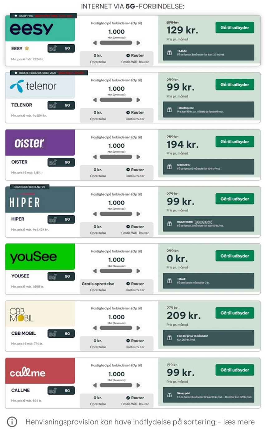 Hvis du er vild med at bruge tid på at sammenligne æbler og pærer, har entreprenante mennesker bekostet adskillige andre portaler på nettet, hvor du kan indtaste din adresse og se, hvem der kan levere hvad – og til hvilke priser.