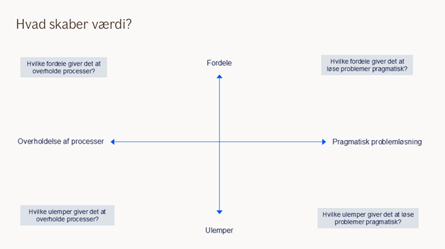 Jeg har brugt denne grafik som udgangspunkt for en diskussion med lederne i min afdeling. Y-aksen går fra fordele til ulemper, mens x-aksen går fra striks overholdelse af processer og retningslinjer til en mere pragmatisk tilgang.