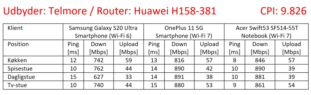Totalt set er Telmore/Huawei testens hurtigste team. CPI (Connected Performance Index) specifikationen, som er summen af mine 12 målinger af downloadhastighed på fire positioner til tre forskellige klienter, lander på 9.826 – et mulehår fra den magiske 10.000-grænse.