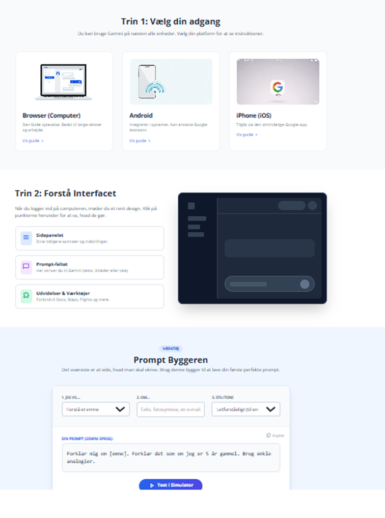Jeg skrev så: "Vis mig, hvordan man kommer i gang med Google Gemini", og så lavede den en meget fin begynderguide med grafik, knapper man kunne trykke på, etc. Helt vildt.