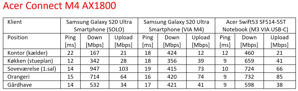 Jeg har haft routeren placeret forskellige steder i huset og haven i op til en meters afstand til to af mine sædvanlige, opkoblede klienter – trådløst til en Samsung Galaxy S20 Ultra-smartphone og USB-C-kablet til en Acer Swift-laptop.