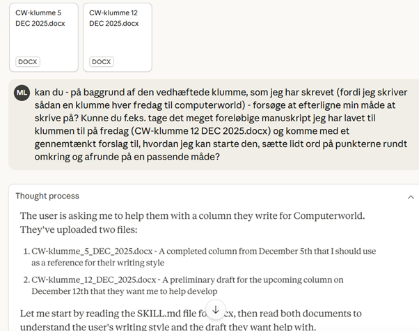Jeg tegnede derfor straks abonnement til Claude, slog Opus 4.5 til, og voila! - det kan være, at jeg endelig har fundet en løsning på en af mine store, selv-valgte udfordringer, nemlig at få en AI til at skrive som mig (eller en anden).