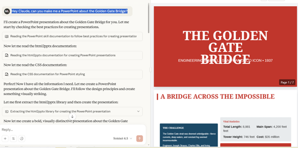 Det med powerpoints var noget, den selv foreslog som prompt, og det gik forbløffende godt (med en enkelt skønhedsfejl i den første slide), men for os, der ikke orker at drøne rundt i Powerpoint, er det her virkeligt godt: