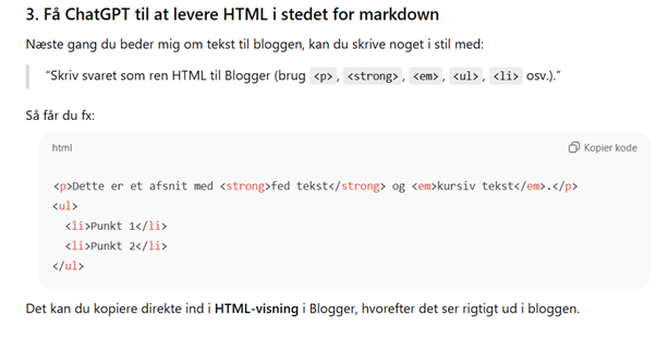 Når jeg for eksempel har kopieret et svar fra ChatGPT ind i blogger (for at lave en blogpost) har det pæne output fra ChatGPT forandret sig til et grimt helvede a la dette: