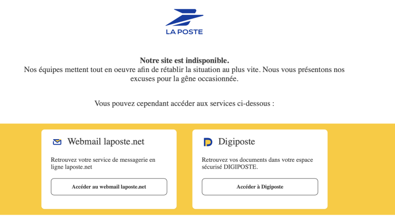 ”Vores hjemmeside er i øjeblikket utilgængelig. Vores medarbejdere gør alt for at genoprette situationen så hurtigt som muligt. Vi beklager den ulejlighed, det måtte medføre,” skriver La Poste på sin hjemmeside.