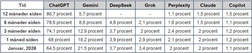 Gemini er gået fra en beskeden markedsandel på 5,7 procent for 12 måneder siden til hele 21,5 procent i januar 2026.