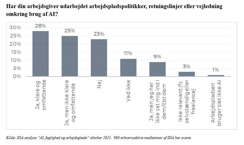 Nu viser en undersøgelse foretaget af fagforeningen IDA blandt ingeniører, it-professionelle og naturvidenskabeligt uddannede, at cirka hver anden af den type ansatte enten slet ikke eller kun delvist har fået klare og omfattende politikker, retningslinjer eller vejledning omkring brug af AI fra deres arbejdsgiver.