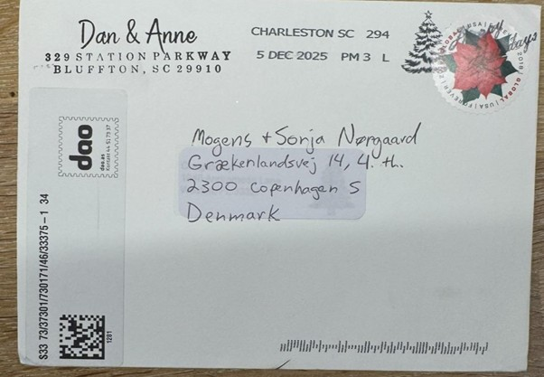 Annes og Dans julekort blev sendt 5. december 2025 og ankom i forgårs, onsdag. Vi tager vores svarbrev med i SK929, når vi besøger dem i juni.