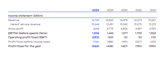 Driftsunderskuddet - EBIT - lander for regnskabsåret 2025 på et flammende minus på en kvart milliard kroner (253 millioner kroner). Det er fem gange mere end driftsunderskuddet året før, hvor Nuuday tabte 50 millioner kroner på driften.