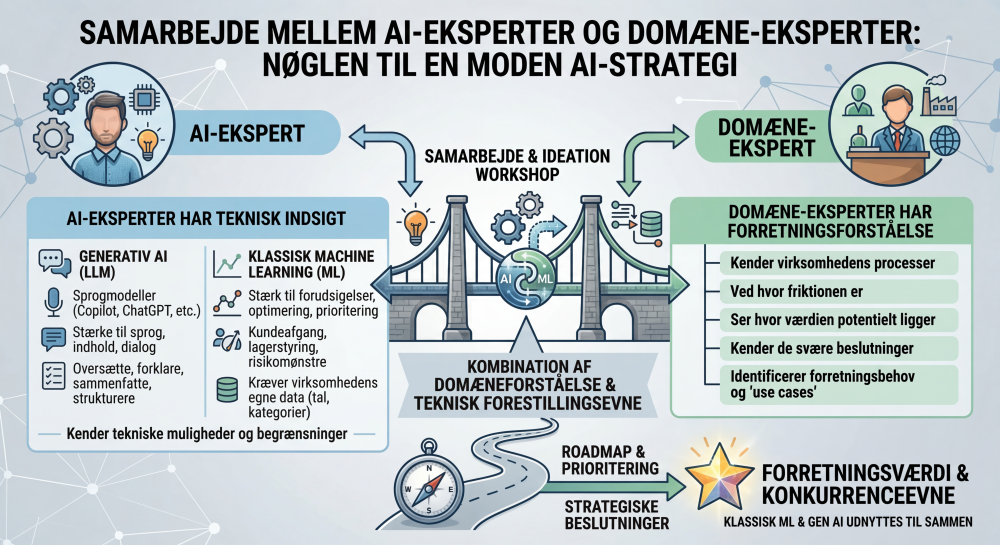 De bedste workshops opstår, når de mennesker, der kender virksomheden og arbejdet indefra, sidder sammen med AI-specialister. Medarbejderne ved, hvor friktionen er, hvor beslutningerne er svære, hvor processerne halter, og hvor værdien potentielt ligger.