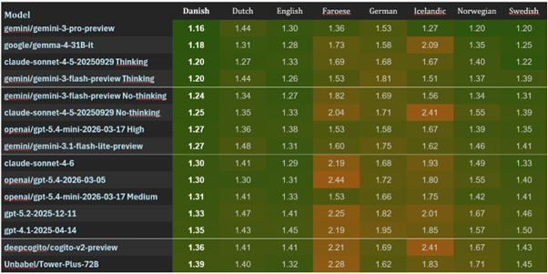 Af EuroEvals benchmark fremgår det, at Gemma 4 31B scorer nær topscore på 1,18 points på dansk, kun overgået af Googles mest avancerede Gemini 3 Pro, som overgår den med en score på 1,16.