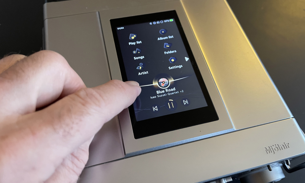 Betjeningen foregår via et 4” farvedisplay på toppen med 800 x 400 pixels opløsning, hvor du kan se albumcovers og justere lydindstillinger.